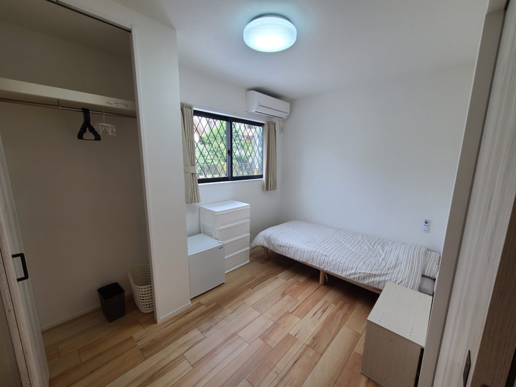 【各部屋設備】エアコン、冷蔵庫、ベット、クローゼット、WiFi、寝具(掛・敷布団とまくら)